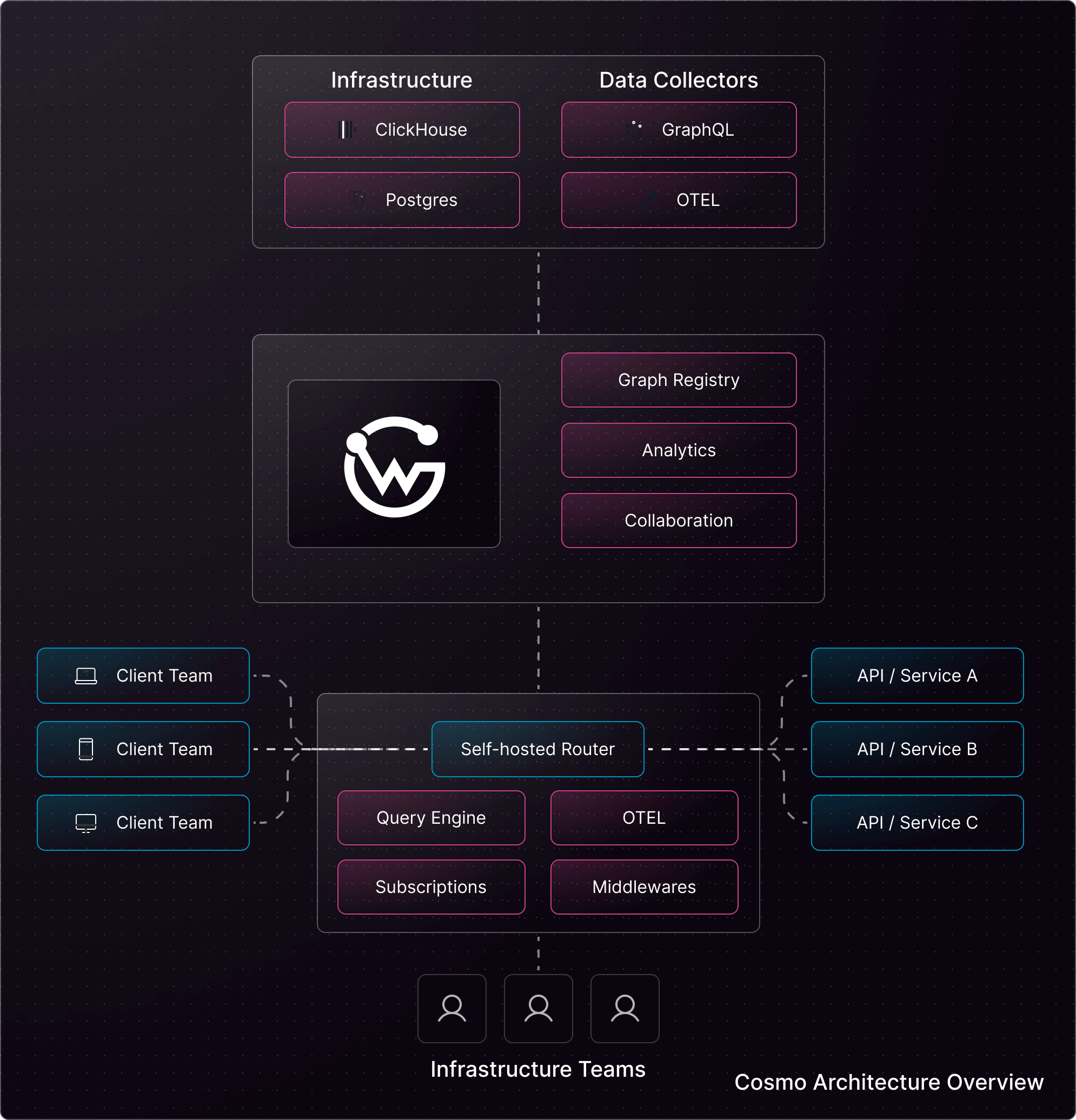 Some organizations operate under very strict regulation. WunderGraph Cosmo Cloud is SOC 2 compliant and fully fit for purpose. However, in the strictest of such scenarios and as a last resort, WunderGraph Cosmo can be fully self-hosted and self-managed. And our team of Solution Architects and Support Engineers stand ready to help navigate the increased costs and complexities that naturally arise in these scenarios. Indeed, the process of setting up any solution to satisfy security audits, SLAs, and other internal constraints, can be complex, time-consuming, and error prone—and self-hosting / self-managing WunderGraph Cosmo is no exception. From ensuring end-to-end encryption, to configuring every component correctly, our team is ready to help create scalable, maintainable, and healthy deployments that shine even in the toughest of conditions. Teams turn to WunderGraph for help with:- Network Architecture & Security;