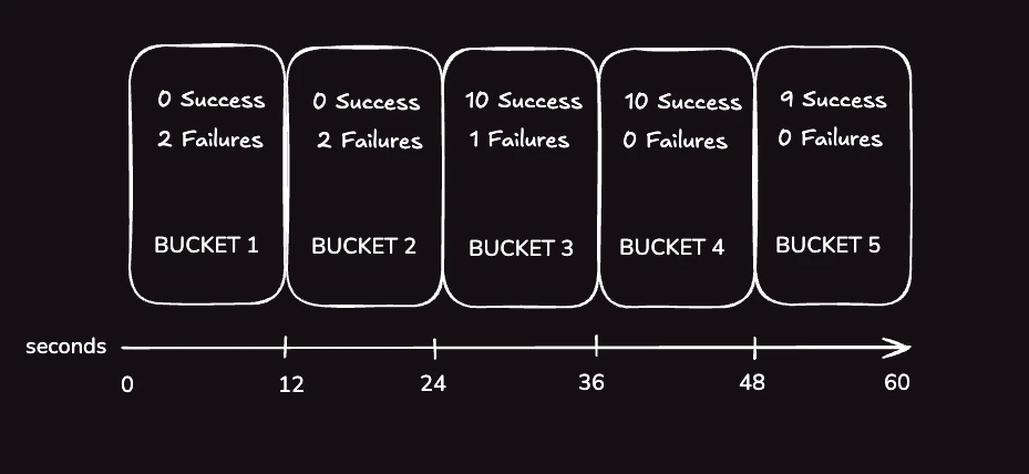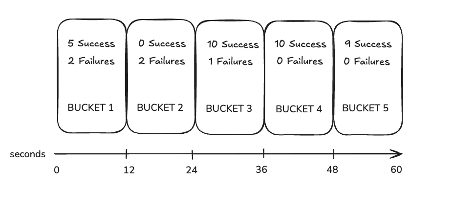 After 60 seconds have elapsed, the circuit breaker has collected a full window of data across all 5 buckets, as illustrated in the diagram below: